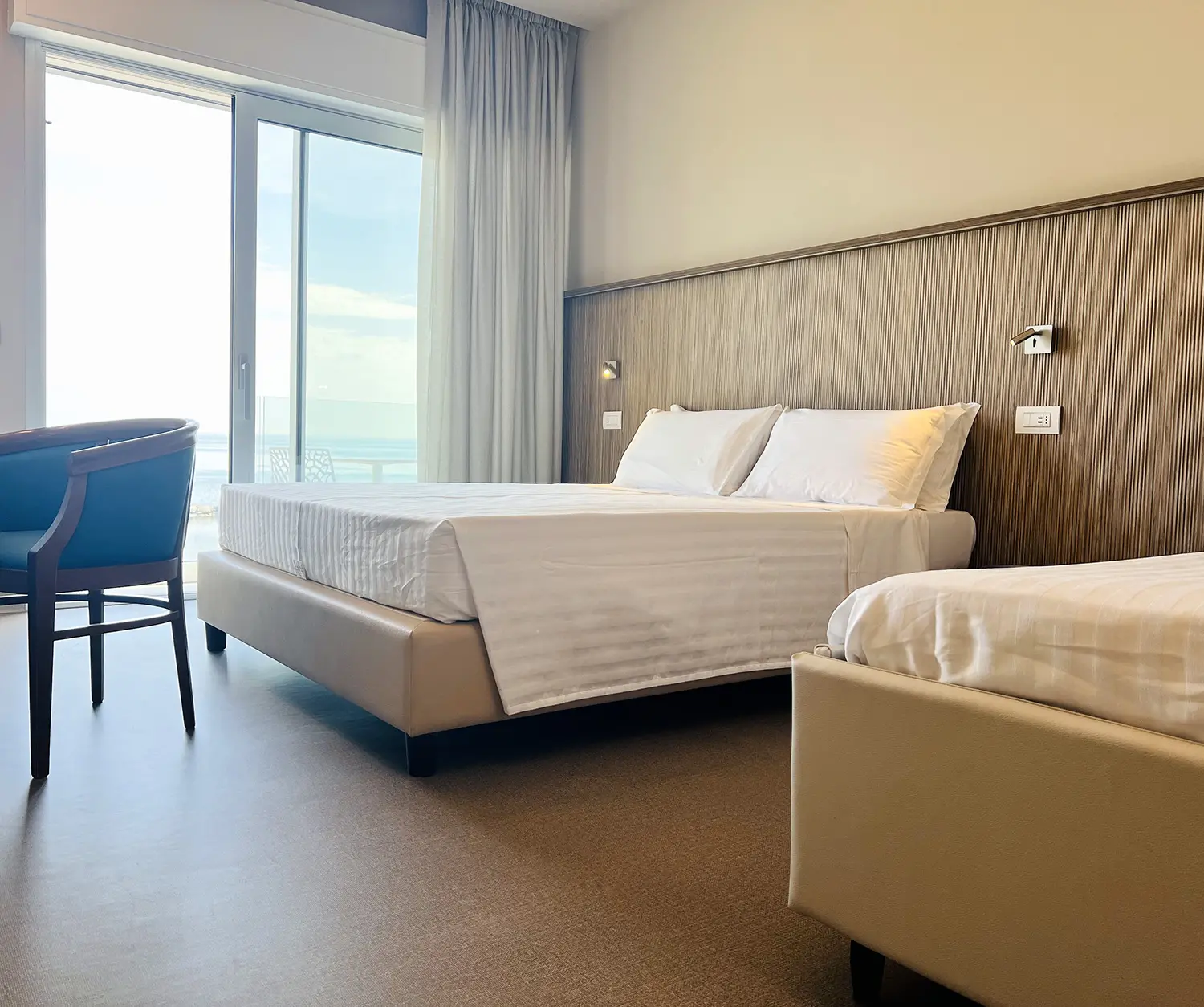 Una grande vetrata offre una vista spettacolare sul mare, permettendo alla luce naturale di inondare lo spazio e di conferire una sensazione di connessione con l'esterno.
