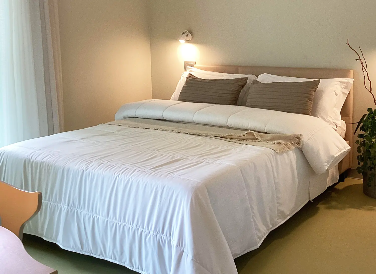 La camera è arredata con un design minimalista e contemporaneo, con tonalità neutre che creano un'atmosfera rilassante.